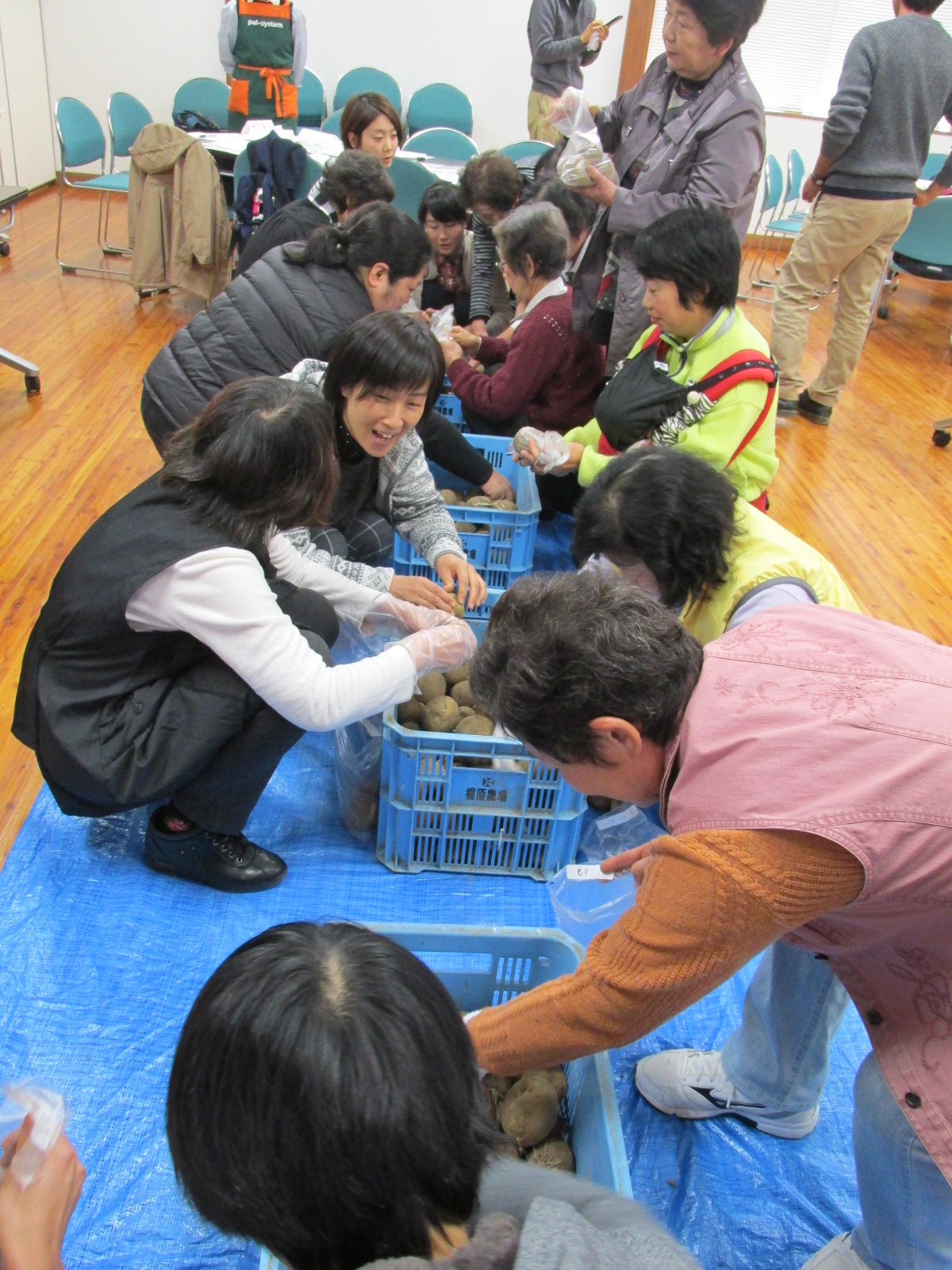 各グループごとの自己紹介の後は、「じゃがいも量目」ゲームを行いました。グループごとの対抗戦で盛り上がり、個人では規定量ピッタリの方もいました。梶原農場の梶原さんから出荷の時の注意点や産地での出荷のことなどお話を聞き、作った野菜がすべて出荷できるわけではなく出荷作業の大変さを体験しながら楽しく学ぶことが出来ました。