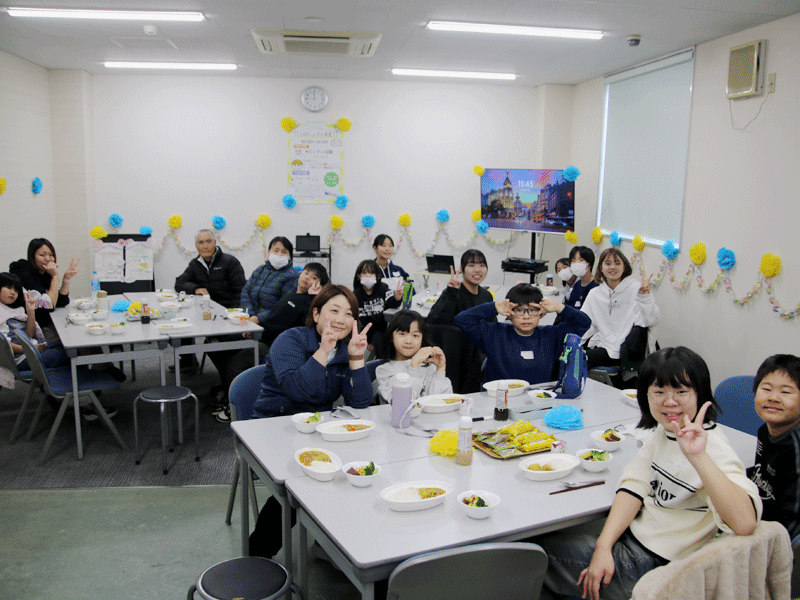 午後は、冬休み初日ということもあり、宿題に取り組むお子さんがたくさんいました。分からない所は中学生や大学生のお姉さんに教えてもらいながら、楽しく勉強する様子が見られました。他には、折り紙やオセロなどを大人と一緒に遊んだり、大人同士のおしゃべりも見られ、それぞれ楽しい時間を過ごしていただきました。