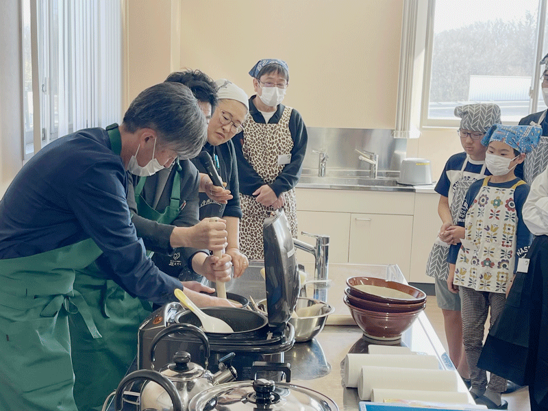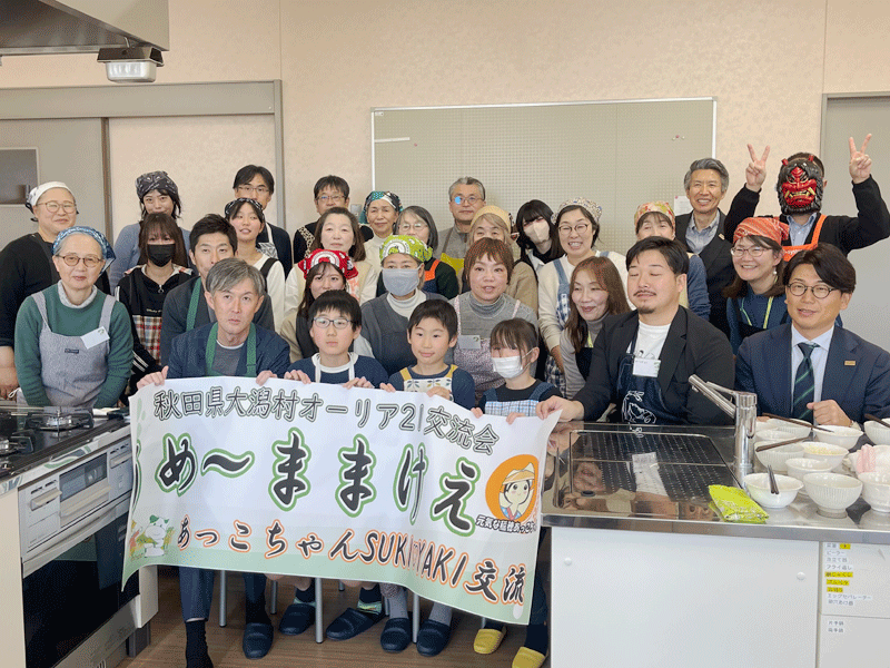 調理交流では、炊き立ての「あっこちゃん」を使い、生産者直伝の「だまこ」作りに挑戦しました。メインのすき焼きには小林牧場の「甲州ワインビーフ」を使用し、秋田と山梨の魅力が詰まった贅沢なコラボレーションメニューが完成しました。生産者を囲んだ昼食タイムは、どのテーブルも笑い声や感心の声が絶えず、非常に和やかな雰囲気のなか、名残惜しくも終了の時間を迎えました。