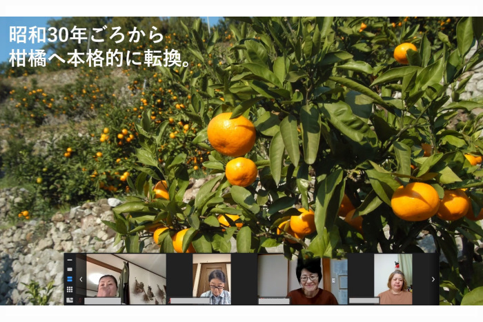 また、現地のみかん畑を中継でつなぎ、生産者の中川様より、みかんの収穫の様子や栽培のご苦労などを伺いました。