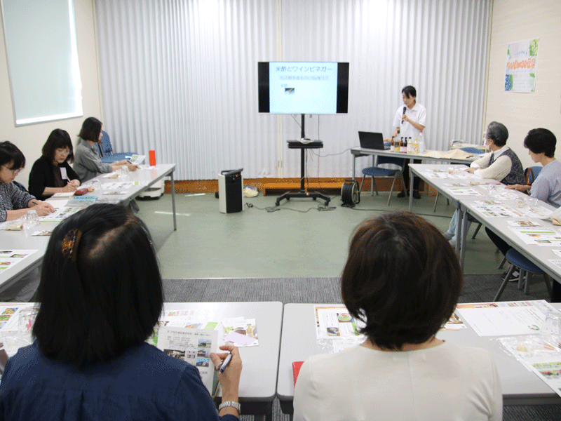 工場見学終了後は、一宮センターへ移動し、ビネガーの魅力についてのお話や実演を交えたビネガー使いこなし術を行い試食もしていただきました。試食の際は、講師と参加者、甲斐の産地応援隊のメンバーで楽しく交流を行いました。