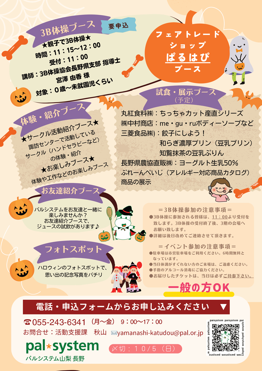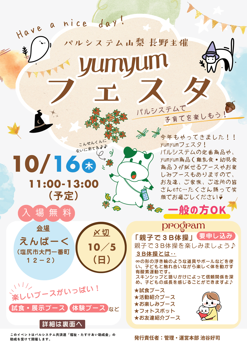 パルシステムの定番商品やyumyum商品(離乳食・幼児食商品)が試せるブース、お楽しみブースもありますので、お友達、ご家族、ご近所の皆さんetc、たくさん誘って笑顔でお過ごしください♪