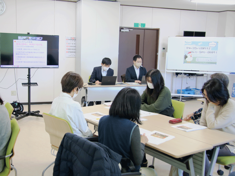 までっこチキン生産者連絡協議会、(株)十文字チキンカンパニー、全農チキンフーズ株式会社、株式会社パル・ミートを講師に、パルシステムの商品「までっこ鶏」の生産についてのお話や鶏糞を使用した『バイオマス発電所』などを学習をしました。