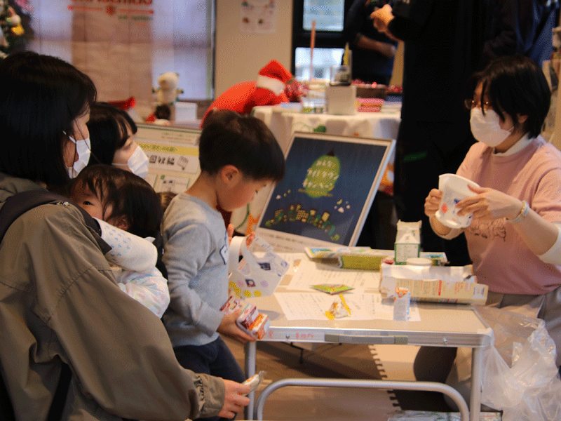 会場には、ヤムヤム商品を紹介するブースやフェアトレードショップぱるはぴ、当組合の活動を紹介するブース、ファーストアート、牛乳パック工作、クリスマスの写真が撮影できるフォトスポットなど、おいしく楽しく参加できるように用意しました。普段気になっていた商品の試食やとろとろ石けん作り、フェアトレードチョコレート販売も喜んでいただけました。