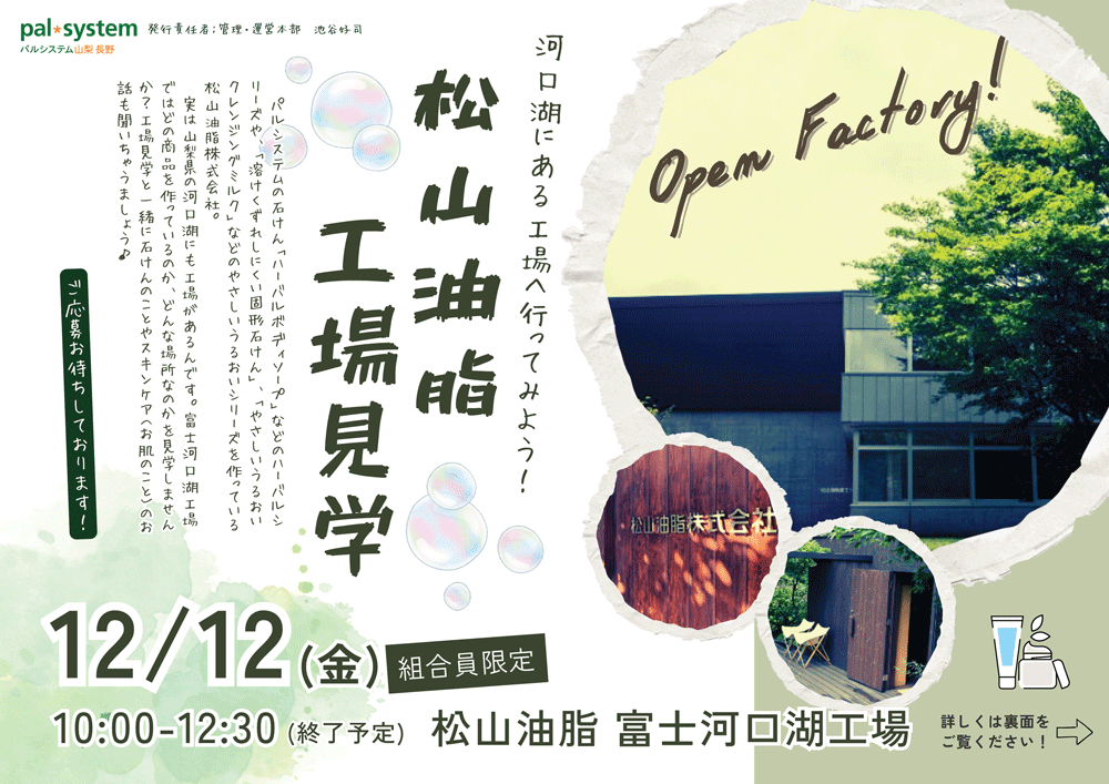 実は山梨県の河口湖にも工場があるんです。富士河口湖工場ではどの商品を作っているのか、どんな場所なのかを見学しませんか?工場見学と一緒に石けんのことやスキンケア(お肌のこと)のお話も聞いちゃいましょう♪