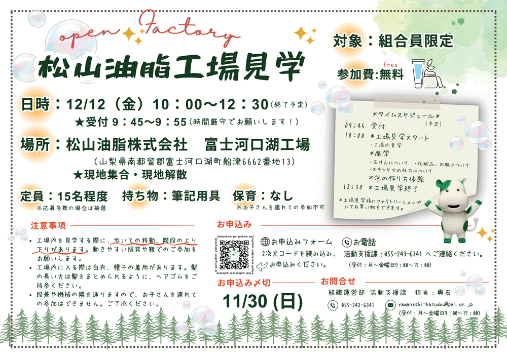 - 工場内を見学する際に、歩いての移動、階段の上り下りがあります。動きやすい服装や靴でのご参加をお願いします。