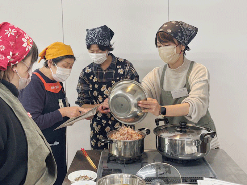 まずは「出汁」や「和食」のお話を聞いていただき、食料自給率、食品ロス削減についても一緒に考えていただきました。今回の和食メニューは”冬メニュー”です。『旬の魚の蒸し物』『春菊の白和え』『切干し大根の煮物』『根菜のみそ汁』の4品を作りました。出汁を取った経験があまりない方に実際に出汁を取ってもらった後、みんなで協力して調理し、4品の和食ランチを食べながら楽しく交流をしました。ランチタイムの中ではパルシステムの「お魚食べよう」の取り組みについて、参加者の皆さんに聞いていただきました。