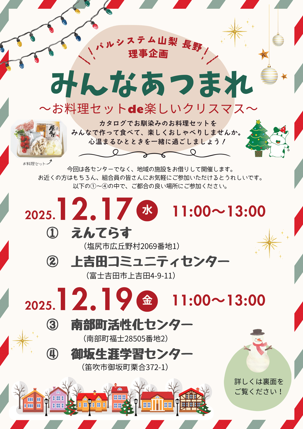 今回は各センターでなく、地域の施設をお借りして開催します。お近くの方はもちろん、組合員の皆さんにお気軽にご参加いただけるとうれしいです。