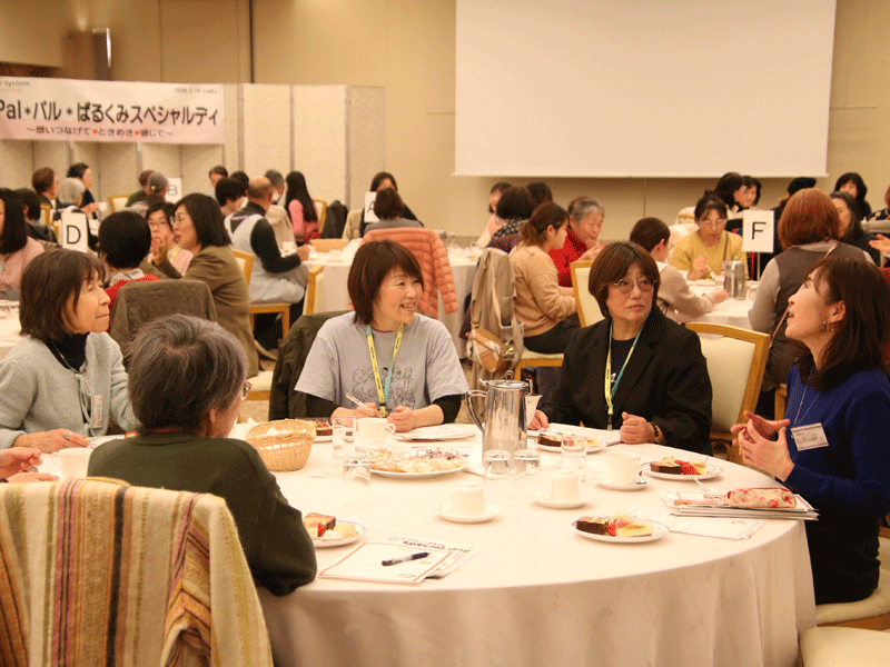 ブースを回ったあとは、テーブルごとの交流タイムです。パルシステムの美味しいスイーツとコーヒー・紅茶を味わいながら、活動談義に花が咲いていました。パルシステム山梨 長野の活動を支えてくださっている皆さんも、これから活動を考えている皆さんも、笑顔あふれるイベントとなりました。