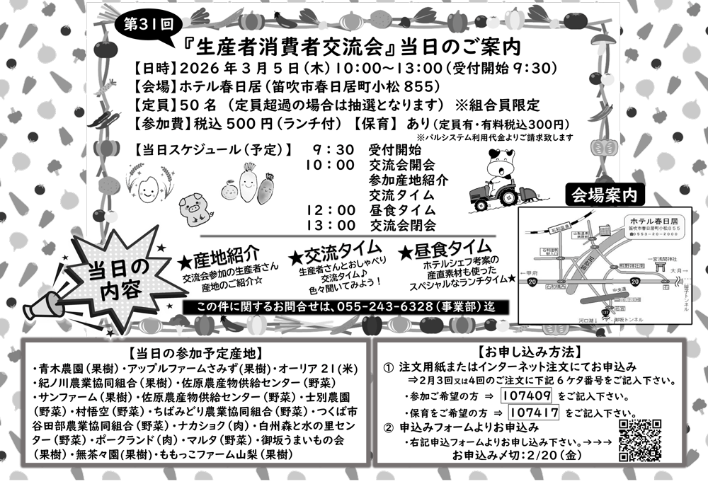 今回で31回目を迎える「生産者消費者交流会」を、今年はホテル春日居(山梨県笛吹市)で開催します。