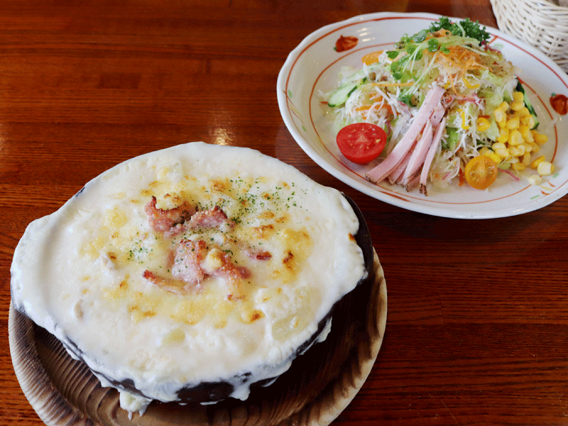 こだわりは、時間をかけて作ったものを出すということ。「田舎料理のように素朴で、懐かしさを楽しんでいただければ」と。本日は、何を食べようか迷ったが、ポテトグラタンとコンビネーションサラダを注文。ひとしきり撮影してから食べても超熱々のポテトグラタン。フーフーしながら食べ進むのだが、素朴なホワイトソースとホクホクのじゃがいもと旨みたっぷりのベーコン、良く伸びる良質なチーズが絶妙。木の受け皿にあふれる2人前はありそうな量を最後の一口まで飽きることなく食べることができる。シャキシャキで新鮮なサラダの両方を食べ終わった後には、何かフルコースを食べ終わったかのような満足感が広がる。
