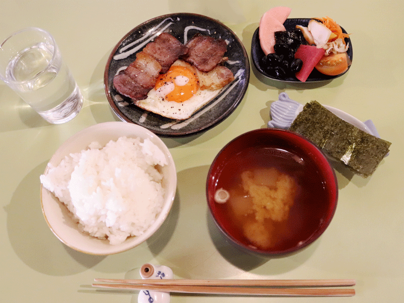 料理のコンセプトは家庭料理の延長線で、尋ねられればレシピも教えてくれるそう。朝食セットは3種類から選べ、本日はご飯とみそ汁とお惣菜のセットにベーコンエッグを追加。お惣菜は所狭しと、キャロットラペ、カブの酢漬け、トマト、黒豆、蒸し鶏などの旬の野菜を使ったお惣菜が並び、口に運ぶのが楽しい。ふっくらと炊き上がった甘みのあるごはんと煮干しの出汁をしみじみ感じる優しい味わいの味噌汁で幸せな朝の始まりを感じた。